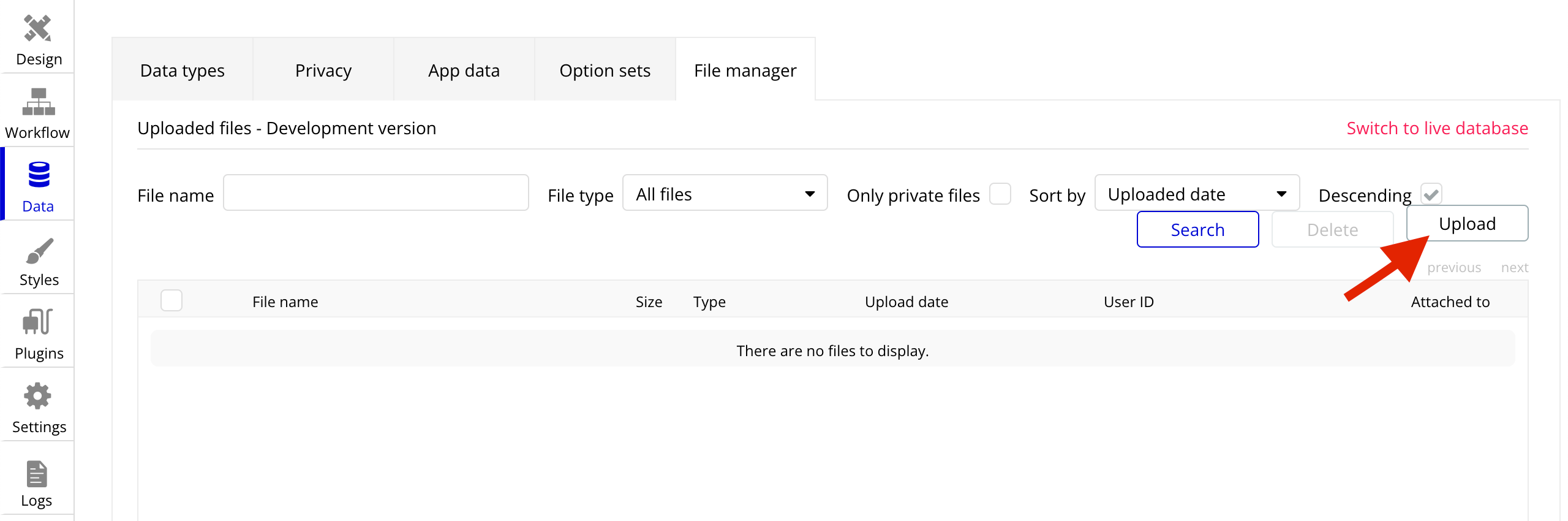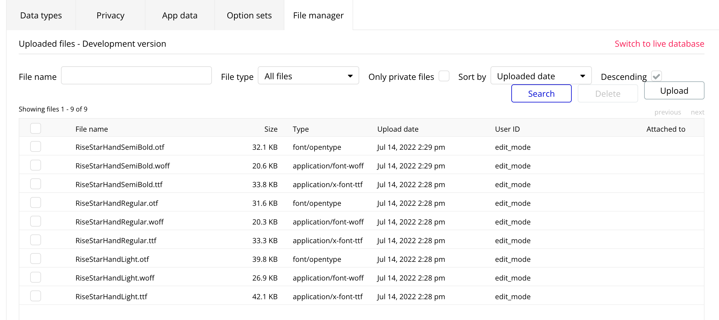 With your fonts downloaded in different formats, you’ll then need to upload each format into Bubble. The simplest way to do this is to go your Data Tab, then select the File Manager tab. You’ll then see a button labeled ‘Upload’ - click on it and upload each font.