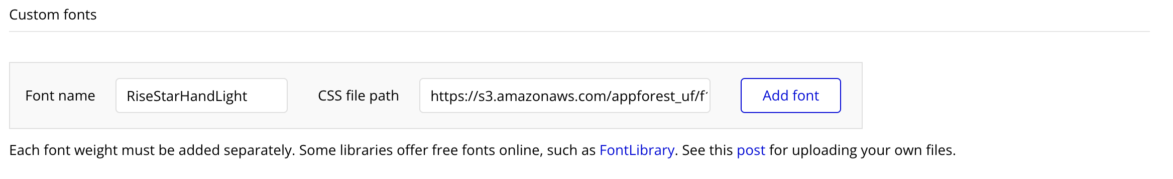 In the Font Name input, type in the name of the font exactly as you saved the file name. In the CSS file path input, paste the link you copied from the CSS file, then click on ‘Add Font’. You’ll notice the uploaded font appear above.