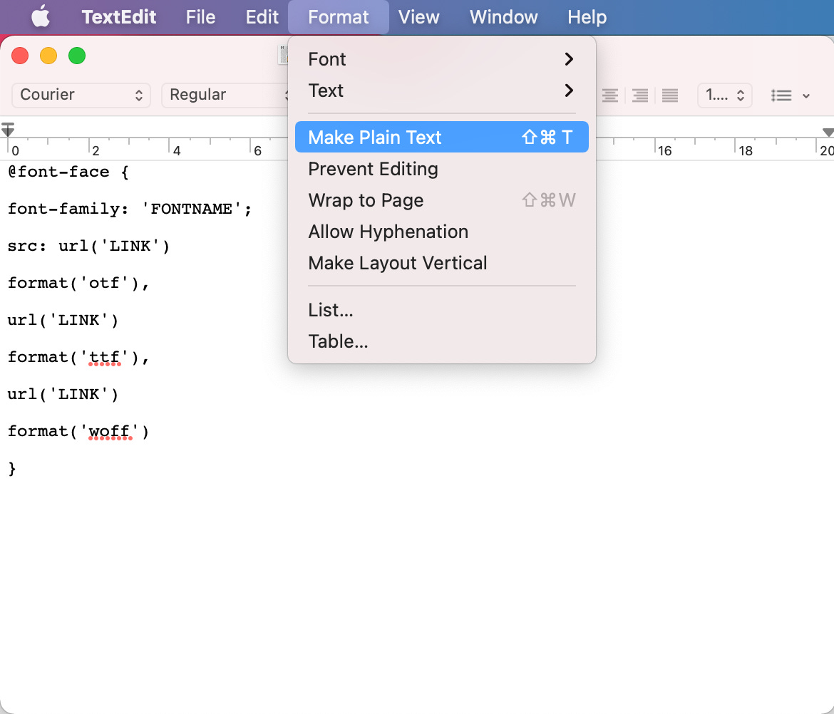 Note: If you’re using a mac, you’ll need to make sure that you change your editor to plain text by going to Format → Make Plain Text.