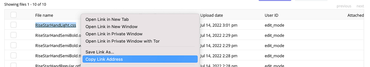 Back in Bubble, you’ll need to click on the Upload button again in the File Manager tab, and upload the CSS file you just created. You’ll then need to copy the address for this CSS file.